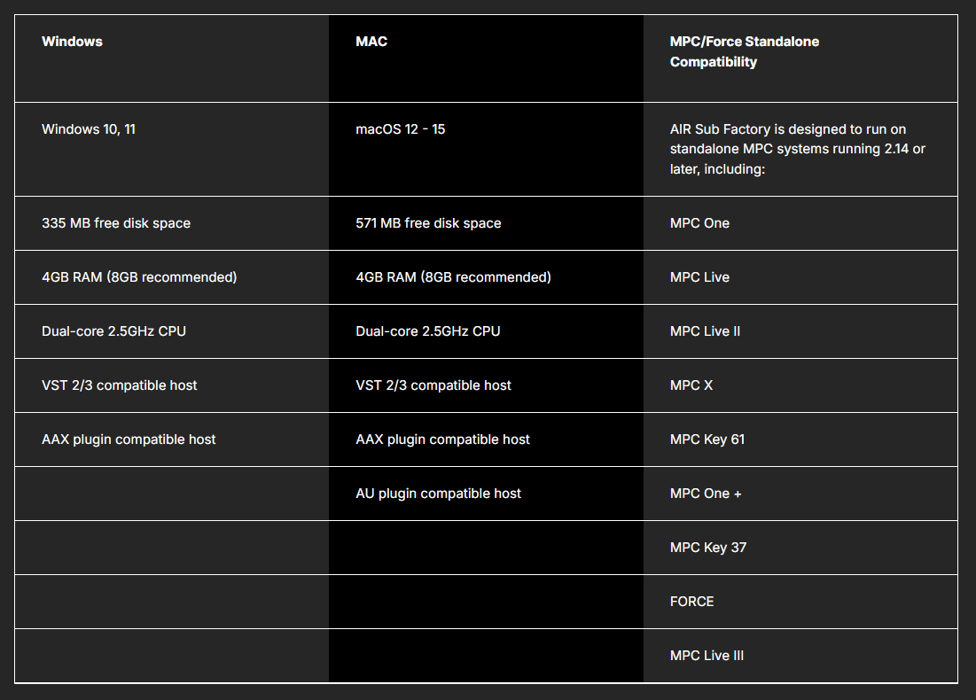 Always check the product pages for each software, as they provide detailed information on compatibility, including whether it supports MPC Standalone operations. Below, is a screenshot from Sub Factory's product page, which includes MPC compatibility.