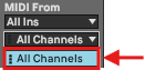 トラックの MIDI チャンネルが All Channels に設定されていることを確認してください。