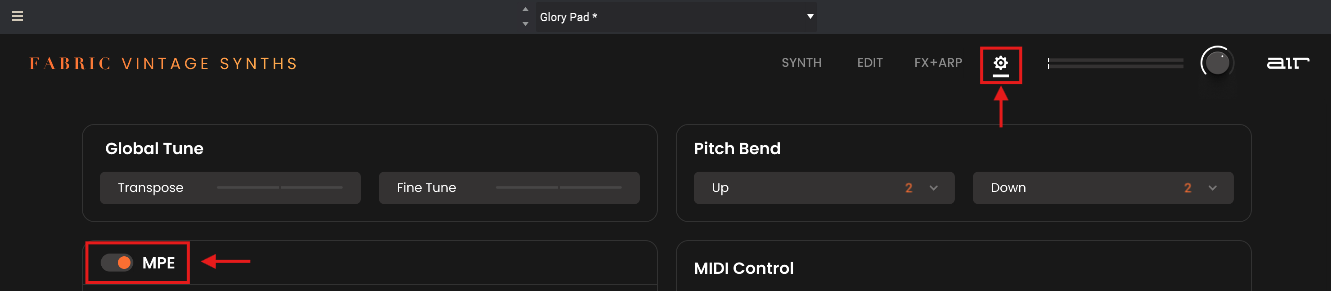 Fabric Vintage Synths のいずれかで MPE を有効にするには、